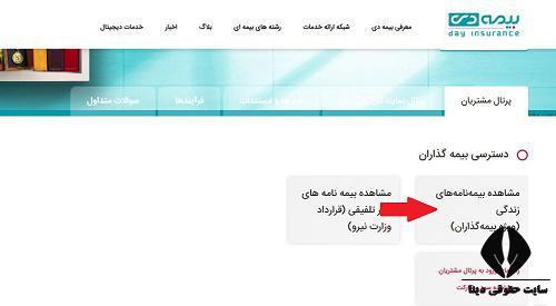 افراد ابتدا باید وارد سایت بیمه دی، شده و پس از ورود به سایت dayins.com، بر روی گزینه پرتال بیمه های زندگی، کلیک نمایند.