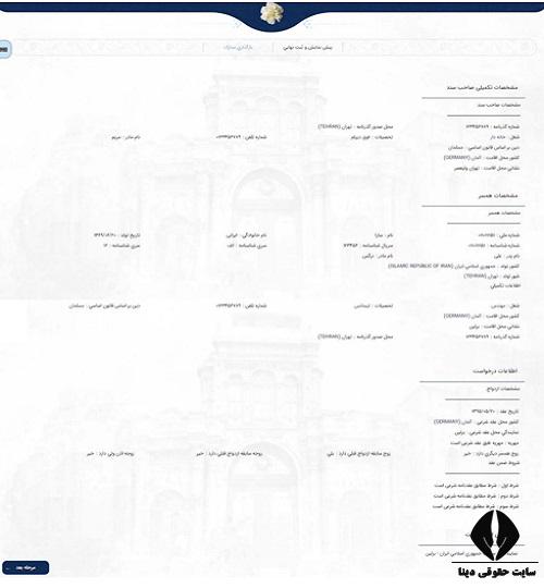 مطابق مقررات نحوه ثبت ازدواج ایرانیان در خارج از کشور، در سایت میخک، در این مرحله، اطلاعات ثبت نامی شما، نمایش داده می شود. چنانچه، این اطلاعات، مورد تایید شما می باشد، بر روی دکمه مرحله بعد، کلیک کرده تا وارد صفحه بارگذاری مدارک شوید.