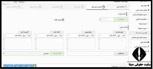 پس از اینکه متقاضی، اطلاعات پیش فاکتور را وارد نمود، باید، به مرحله بعد برود و در صفحه ای مشابه صفحه زیر، اطلاعات گمرکی و حمل و نقل، نظیر نوع قرارداد، تعداد دفعات حمل و نقل و سایر موارد مورد نیاز را وارد نماید.