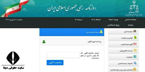برای پرداخت هزینه ثبت آگهی تغییرات در روزنامه رسمی ، می بایست شماره مکانیزه آگهی یا همان کد 18 رقمی دریافت شده در هنگام ثبت تغییرات شرکت را وارد نموده و از قسمت پایین صفحه ، بر روی گزینه مشاهده آگهی کلیک کرد .