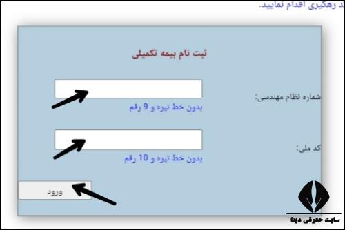 نحوه ثبت نام بیمه تکمیلی نظام مهندسی، با توجه به استان افراد و نوع بیمه ای که سازمان نظام مهندسی برای آنان در نظر گرفته ممکن است متفاوت باشد. به طور کلی افراد جهت کسب اطلاعات در مورد سایت ثبت نام بیمه تکمیلی نظام مهندسی و شرایط خرید آن، لازم است، به سایت نظام مهندسی خود، مراجعه نمایند. در ادامه نحوه ثبت نام بیمه تکمیلی نظام مهندسی استان تهران برای نمونه آورده شده است.