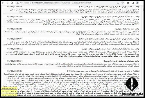در قسمت بالای صفحه نماد ایران خودرو، بخشی با عنوان پیام ناظر وجود دارد که با کلیک بر روی این بخش می توان آخرین پیام های ناظر بازار مربوط به هر نماد را مشاهده و بررسی کرد.