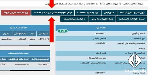 در مرحله بعدی، متقاضی باید گزینه ارسال اظهارنامه عملکرد و یا تبصره ماده ۱۰۰ را همانند تصویر زیر انتخاب نماید.