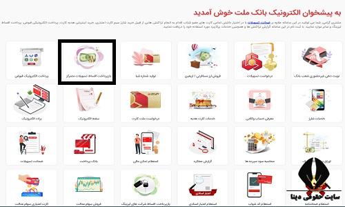 با انتخاب گزینه بانکداری الکترونیکی صفحه ای از خدمات ارائه شده به صورت اینترنتی از سوی بانک ملت نمایش داده می شود که برای پرداخت اقساط باید از بخش سامانه های مبتنی بر وب ، گزینه پرداخت اقساط تسهیلات انتخاب شود.