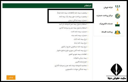 در صفحه مربوط به استعلام، سه گزینه اول مربوط به استعلام انواع موارد مورد نیاز است که با انتخاب هر یک از آن ها می توان خدمات مورد نظر خود را با ورود اطلاعاتی مانند کد بیمه گذار و شماره بیمه نامه دریافت کرد.