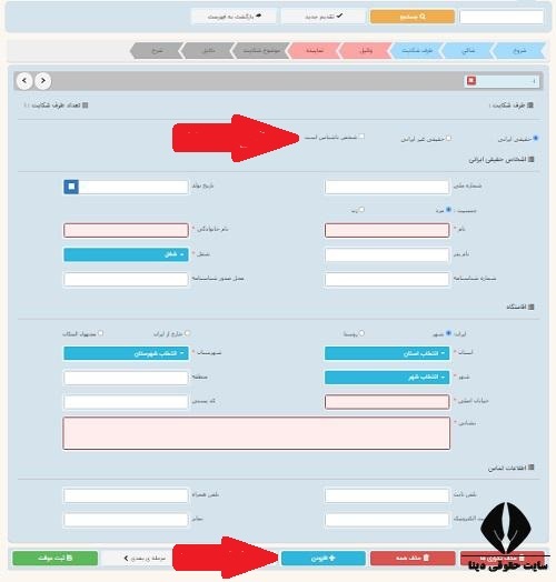 در این قسمت، متقاضی باید اطلاعات خود به عنوان شاکی را ثبت و به مرحله بعدی برود.