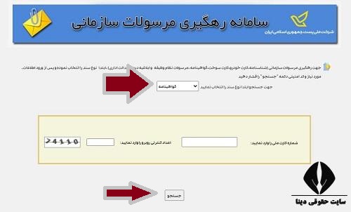 پیگیری مرسوله از طریق مراجعه به سایت tracking.post.ir: که برای این کار، فرد باید، آدرس مذکور را در مرورگر سیستم یا تلفن همراه خود، جستجو کند و پس از هدایت شدن به صفحه ای مشابه صفحه زیر، کد مرسوله خود را در کادر مربوطه، درج و برروی گزینه "جستجو"، کلیک نماید.