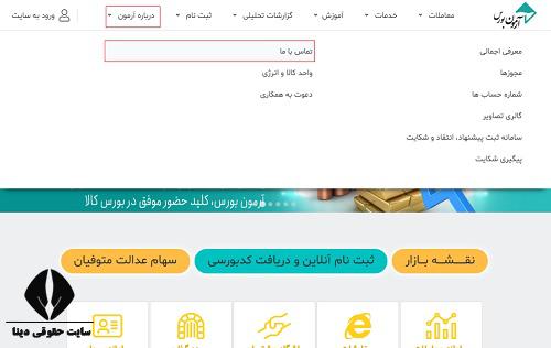 برای این امر، افراد باید، آدرس سامانه کارگزاری آرمون بورس armoonbourse.co.ir را در مرورگر تلفن همراه یا سیستم خود، جستجو کرده و پس از ورود به صفحه اصلی سایت، از فیلد درباره آزمون، گزینه "تماس با ما" را انتخاب کنند.