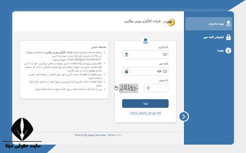 چنانچه فرد در مرحله پیشین، گزینه "سامانه معاملات آنلاین" را انتخاب کرده باشد، به صفحه ای مشابه تصویر زیر، هدایت خواهد شد و می تواند پس از درج نام کاربری، رمز عبور و اعداد تصویر امنیتی، به پورتال خود، دسترسی یابد.