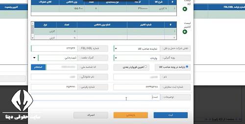 در این مرحله، فرد باید، نقش شرکت حمل و نقل، شماره FBL/HBL، رویه گمرکی، گمرک مقصد و سایر اطلاعات مورد نیاز را وارد و تعیین نماید و برروی گزینه "ثبت"، کلیک کند.
