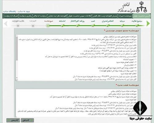 سپس برای متقاضی متن صورت جلسه مجمع عمومی شرکت و هیات مدیره، به نمایش گذاشته می شود که پس از مطالعه و تایید آن باید بر روی گزینه گام بعدی کلیک کند.